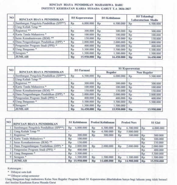 Institut Karsa Husada Garut, berkomitmen untuk menyediakan pendidikan berkualitas dengan biaya yang terjangkau. Informasi biaya pendidikan berikut disusun untuk membantu calon mahasiswa memahami komponen pembiayaan yang perlu dipersiapkan selama masa studi.